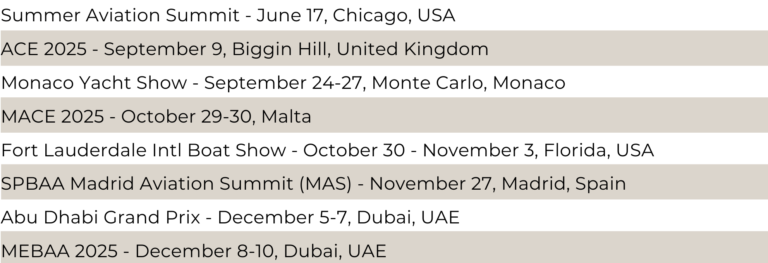 We are delighted to announce our upcoming events, presented in collaboration with the esteemed OOAK Agency. We eagerly anticipate welcoming you to Milan for Spring Aviation Summit and to catch up at EBACE 2025.